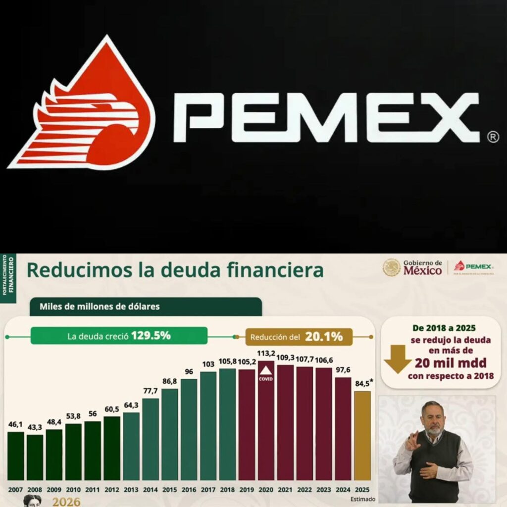 Pemex redujo 20% de deuda fue confirmada este miércoles por la Secretaría de Energía, al informar que Petróleos Mexicanos logró disminuir su pasivo total en 20 por ciento durante 2025 gracias a instrumentos financieros aplicados en coordinación con la Secretaría de Hacienda y Crédito Público como parte del Plan de Fortalecimiento de Pemex 2025-2035.