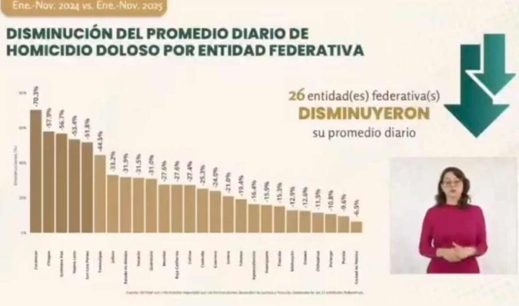 CIUDAD DE MÉXICO.- El estado de Quintana Roo figura entre las entidades con mayor avance en la disminución de homicidios dolosos, al ubicarse en la tercera posición nacional por reducción en el promedio diario de este delito.