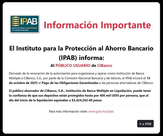 - El IPAB notificó a los clientes del banco que el 13 de octubre se comenzará con el pago de las obligaciones garantizadas a los ahorradores.