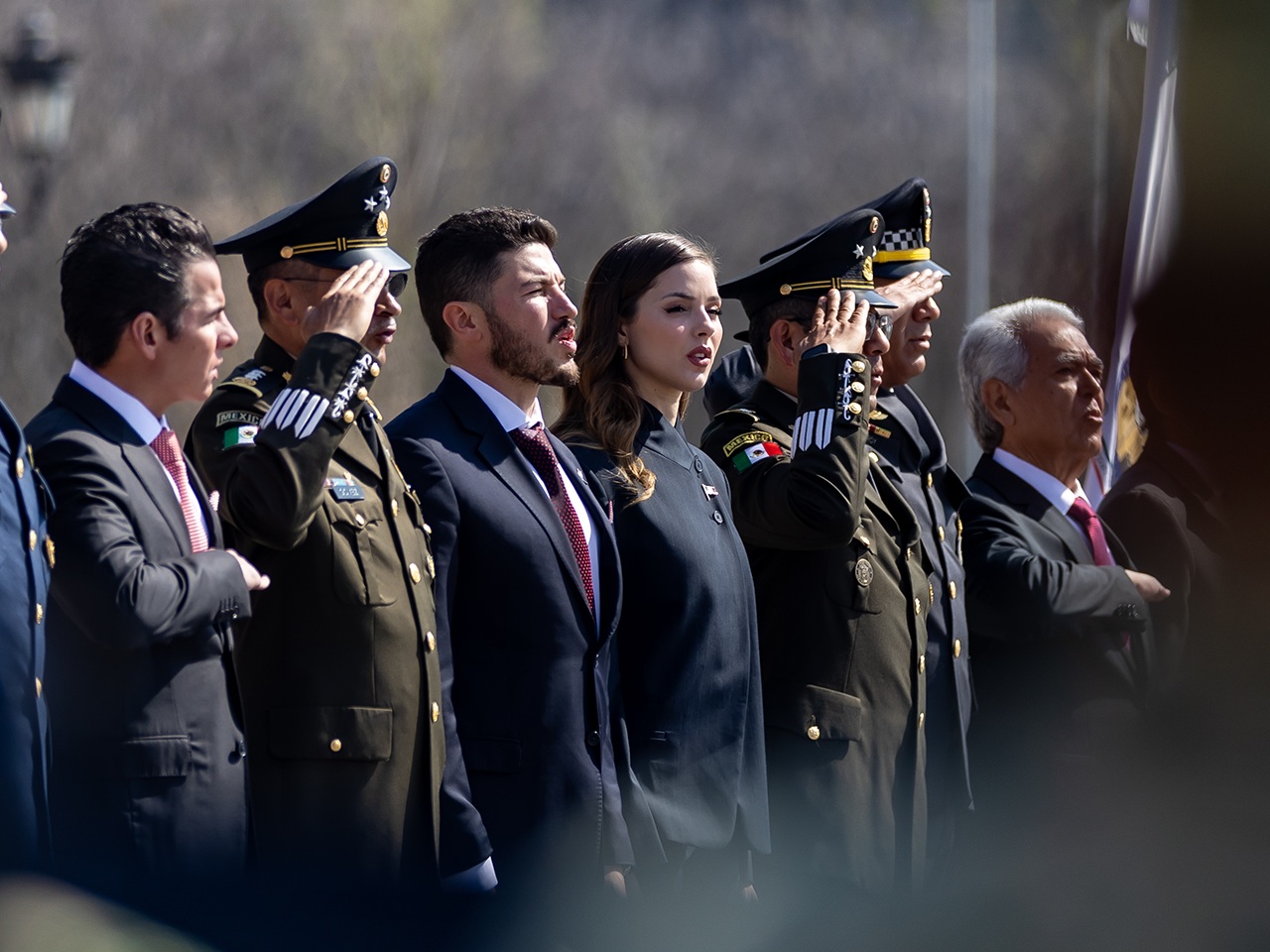 NUEVO LEÓN.- Al encabezar la Ceremonia Conmemorativa del Día de la Bandera, el gobernador llamó a honrar la bandera con trabajo diario.
