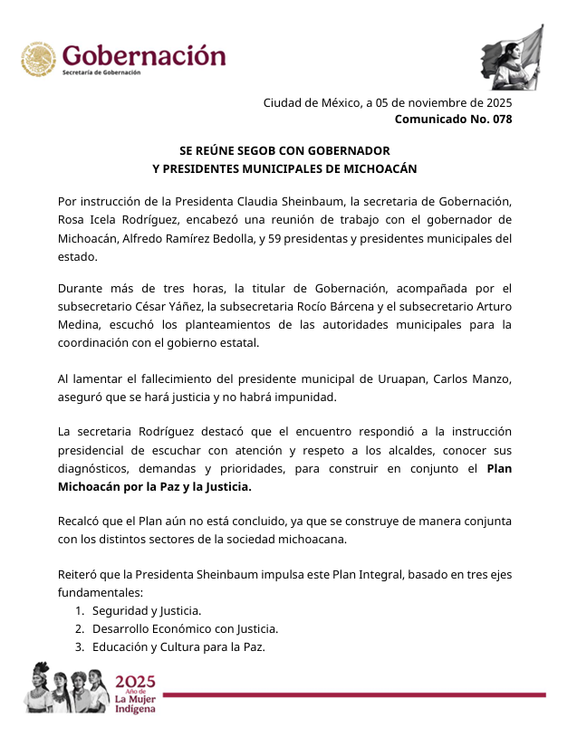 La Secretaría de Gobernación (Segob), encabezada por Rosa Icela Rodríguez Velázquez, y el gobierno del estado de Michoacán, con su gobernador Alfredo Ramírez Bedolla a la cabeza, junto con alcaldes y alcaldesas de la entidad, acordaron este miércoles establecer un diálogo permanente para definir acciones conjuntas en el marco del Plan Michoacán por la Paz y la Justicia.