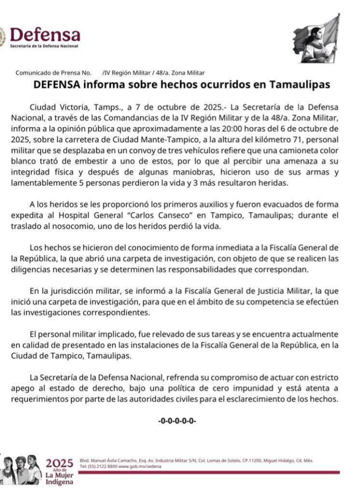 La Secretaría de la Defensa Nacional (SEDENA) confirmó que seis personas fallecieron durante una balacera registrada la noche del 6 de octubre en Tamaulipas, cuando un convoy militar tuvo un enfrentamiento con civíles armados. Cinco murieron en el lugar y una más mientras era trasladada a un hospital.