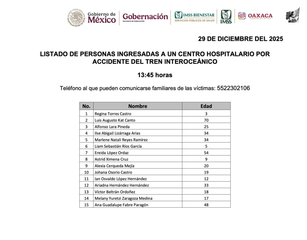La Secretaría de Gobernación (Segob) dio a conocer este lunes la lista oficial de personas hospitalizadas a causa del descarrilamiento del Tren Interoceánico del Istmo de Tehuantepec ocurrido el pasado domingo en Asunción Ixtaltepec, Oaxaca. La difusión de esta información busca facilitar que familiares y allegados puedan localizar a los heridos y comunicarse con los hospitales donde reciben atención médica.