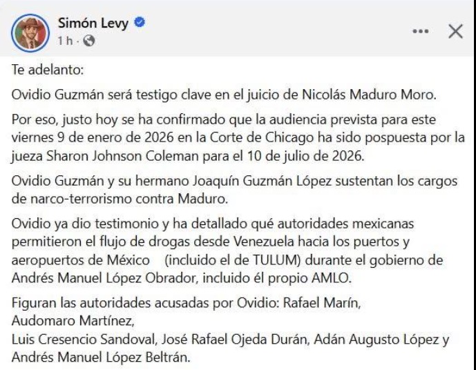 En su publicación, Levy aseguró que Guzmán López se ha convertido en una pieza clave en el juicio que se sigue en la Corte Federal de Chicago contra el presidente de Venezuela, Nicolás Maduro Moro, por cargos de narco-terrorismo. Según el exfuncionario, la audiencia originalmente programada para el 9 de enero de 2026 fue aplazada, y que en ella “podrían surgir” testimonios que mencionen a autoridades mexicanas como posibles facilitadores de rutas de droga vinculadas con Venezuela.