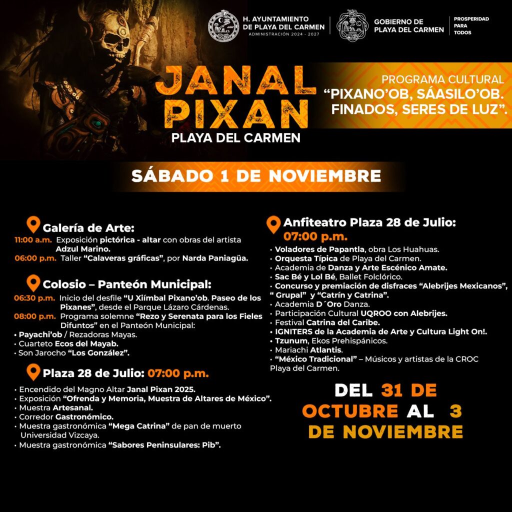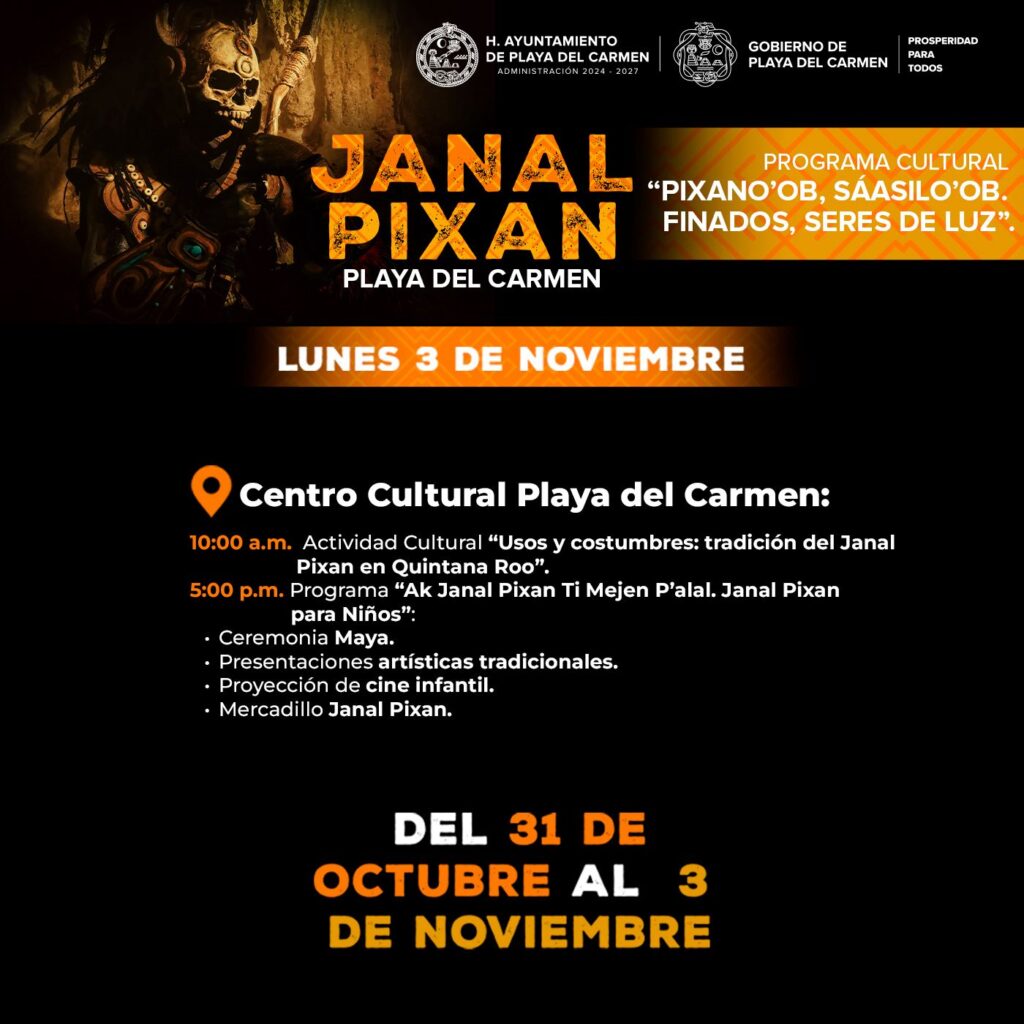 PLAYA DEL CARMEN.- Todo se encuentra listo para que este viernes 31 de octubre den inicio en Playa del Carmen las festividades del Janal Pixan 2025 “Pixano’ob Sáasilo ‘ob. Finados seres de luz”, con acceso totalmente gratuito a todas las actividades para las y los playenses y turistas, a fin de mantener viva esta tradición ancestral.