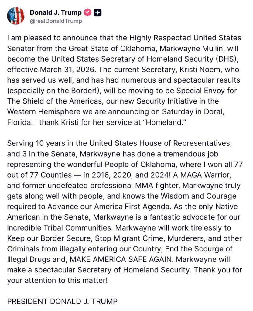 Tras el anuncio de que Trump despide a Noem, la Casa Blanca informó que el senador Markwayne Mullin será propuesto para dirigir el departamento.